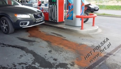 - Rozlaną ciecz posypać równomiernie absorbentem.