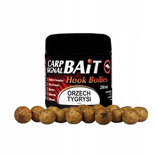 Carp Signal Bait Hook Boiles – Seria wysokiej jakości tonących kulek proteinowych oparta całkowicie na najwyższej jakości naturalnych produktach bogatych w białka, tłuszcze i węglowodany. Znacznie ulepszony skład wzbogacony o nowe rozwiązania na bazie wielotygodniowych testów na wielu akwenach. Stworzone do łowienia ostrożnych oraz słabo żerujących karpi. To wysokiej jakości produkty zawierające w sobie wiele substancji odżywczych, smakowych i zapachowych, które w łowisku tworzą sygnał, odpowiadający za pobudzenie ryb do żerowania. Produkowane są z użyciem protein, witamin, minerałów, słodzików, betainy, kompleksu aminokwasów oraz sprawdzonych i skutecznych aromatów. Posiadają dużą zawartość ziaren, słodziku oraz betainy. Wabią w ten sposób karpie nawet z dużych odległości. Jakość składników użytych w procesie produkcji sprawia, że mogą one konkurować z produktami znacznie droższymi.