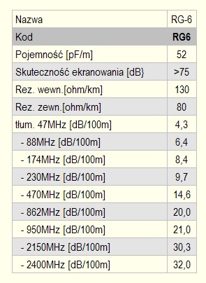 Przewód koncentryczny RG-6 z rdzeniem miedzianym, w płaszczu PE. Płaszcz PE (polietylen), zapewnia odporność na niszczące działanie promieni ultrafioletowych.
