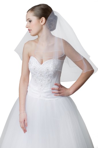 Mamy do zaoferowania Państwu piękny welon ślubny wykonany z białego lub ecru tiulu obszytego mereżką. Welon jest dwuwarstwowy o wymiarach 50/60 cm. Upięty jest na bezbarwnym grzebyku, który ułatwia wpięcie go we włosy.