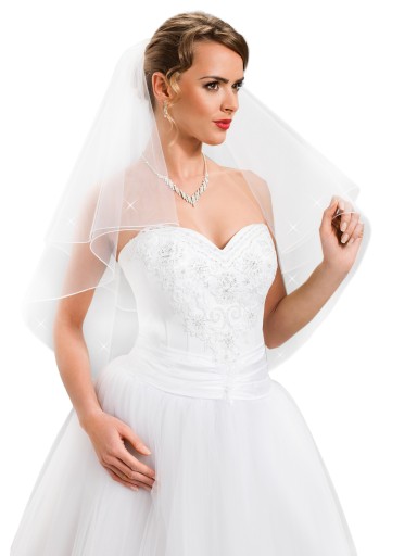 Mamy do zaoferowania Państwu piękny welon ślubny wykonany z wysokiej jakości białego lub ecru tiulu .