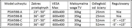 UWAGA: SZANOWNY KLIENCIE, PRZED ZAKUPEM UCHWYTU SPRAWDŹ DOKŁADNIE ROZSTAW VESA ORAZ WAGĘ SWOJEGO TV
