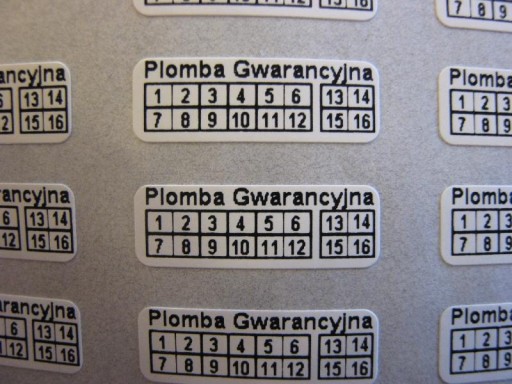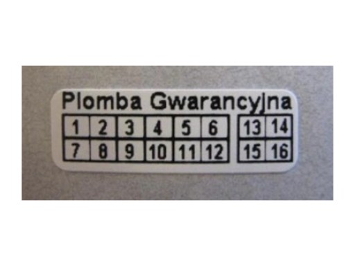 Oferujemy wykonanie 1000 sztuk plomb gwarancyjnych w rozmiarze 15x5mm, z białej łatwo kruszącej się folii (AKRYLIT) z Twoim indywidualnym nadrukiem.