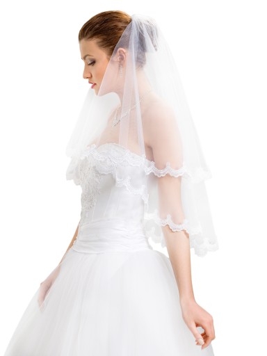 Mamy do zaoferowania Państwu piękny welon ślubny wykonany z białego lub ecru tiulu. Welon jest dwuwarstwowy o wymiarach 55/75 cm, obszyty piękną koronką. Upięty jest na bezbarwnym grzebyku, który ułatwia wpięcie go we włosy.