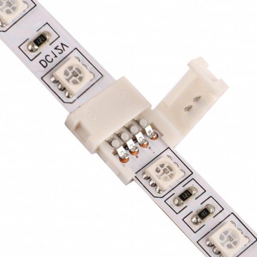 Złącze umożliwia szybkie połączenie taśmy LED RGB o szerokości 10mm (SMD5050 - 4pin) bez konieczności lutowania bądź używania jakichkolwiek narzędzi. Wystarczy odpowiednio umieścić taśmę oraz zamknąć zatrzask aby otrzymać solidne połączenie.