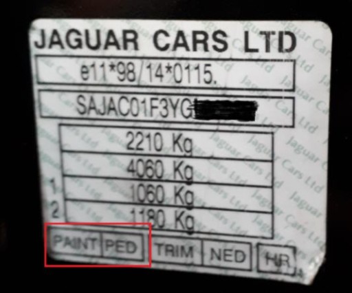 Oznaczenie koloru lakieru znajdą Państwo na tabliczce znamionowej znajdującej się na lewym słupku B przy zawiasach drzwi Tylnych lewych. W dolnym lewym narożniku pozycja PAINT _ _ _ np: PED (czarny metalik)