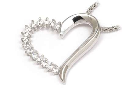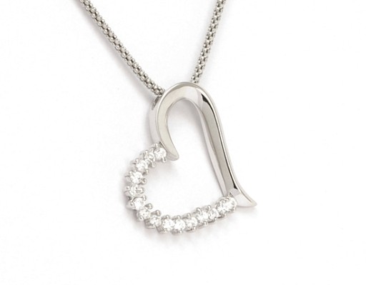 Przedmiotem aukcji jest uroczy srebrny komplet: ażurowy wisiorek z cyrkoniami w kształcie serduszka oraz łańcuszek. Zawieszka i łańcuszek w całości wykonane są z rodowanego srebra. Warstwa twardego, szlachetnego rodu zabezpiecza srebro przed oksydowaniem (ciemnieniem) i rysowaniem się powierzchni.