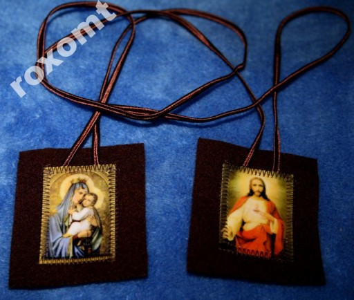 Na jednym kawałku sukna znajduje się obraz Jezusa z otwartym sercem, a na drugim Matka Boża z Góry Karmel.