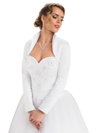 Mamy do zaoferowania Państwu bolerka ślubne z długim rękawem. Wykonane są one bardzo starannie z atłasu, dostępne w kolorze białym, ecru lub czarnym.