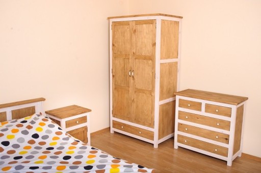 - Szafka nocna z drewna litego sosnowego, pokryta naturalnym woskiem w dwóch kolorach. Elementy konstrukcji szafki pokryte zostały woskiem w kolorze białym, nie kryjącym struktury drewna, natomiast drzwi, szuflada, blat oraz filunki boczne pokryte zostały woskiem w kolorze orzech,szuflady bez prowadnic,otwieranie odbywa sie po drewnianych listwach..