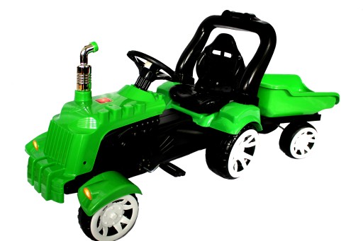 Przednia oś skrętna za pośrednictwem kierownicy wyposażonej w klakson. Dodatkowymi gadżetami są reflektory, ruchomy komin, osłony na koła i hak dzięki czemu traktorek przypomina prawdziwy pojazd. Tak jak wskazuje nazwa Traktor farmerski nie może się obyć bez odpowiedniej przyczepy. Przyczepę można w bardzo prosty sposób zamocować do haka. Skrzynia załadowcza wyposażona jest w kiper, co ułatwia szybkie jej opróżnianie. Dzięki pojemnej skrzyni załadowczej na przyczepkę dziecko może załadować przeróżne rzeczy sporych gabarytów, dzięki czemu czerpie z zabawy frajdę.