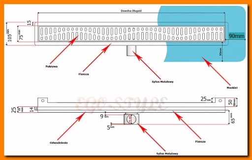 Odpływ liniowy oferowany na tej stronie to odpływ z wygiętą flanszą (kołnierzem), przyścienny, z syfonem metalowym z rusztem ozdobnym - do wyboru 10 wzorów