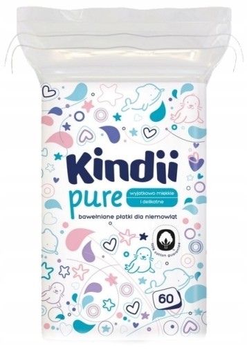 Opakowanie 60 sztuk bawełnianych płatków kosmetycznych dla niemowląt marki Cleanic Kindii.