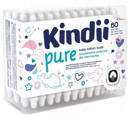 Opakowanie 60 sztuk bawełnianych patyczków higienicznych z ogranicznikiem dla niemowląt marki Cleanic Kindii.