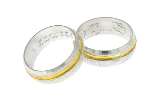 Obrączki są wykonane w całości ze srebra w próbie 925 model ten posiada pozłacany rowek. Wgłębienie powoduje iż złocenie nie wyciera się szybko tak jak w przypadku innych modeli. Obrączki znakowane są zgodnie z Polskim prawem probierczym. Grawerowanie wewnątrz obrączki oraz etui są gratis.