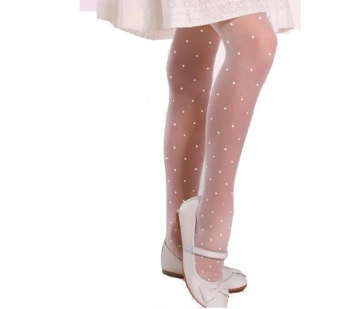 Wzorzyste rajstopy dziecięce Imka firmy Fun-Pol wykonane są z dodatkiem przędzy typu elastan, ozdobione delikatnym wzorem w kropki.