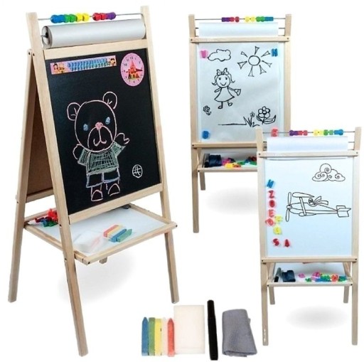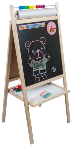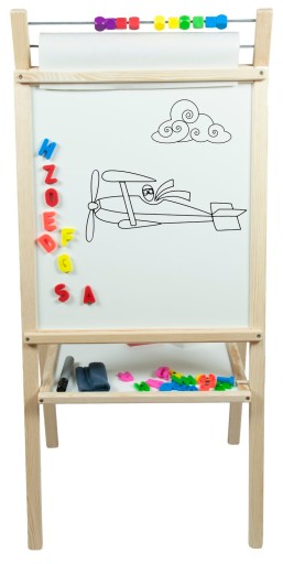 Drewniana, dwustronna i rozkładana tablica magnetyczna to świetny pomysł na kreatywną zabawę Twoich Pociech. Nauka przez zabawę to najlepszy sposób na prawidłowy rozwój dzieci. Tablica jest idealnym miejscem na ćwiczenie pierwszych literek oraz cyferek. To także świetne miejsce do rozwijania zmysłu artystycznego przez wykonywanie wspaniałych rysunków. Jest również przyrząd wspomagający naukę liczenia - liczydło z kolorowymi kulkami! Z jednej strony jest to tablica magnetyczna do pisania markerami, z drugiej - tradycyjna tablica kredowa.