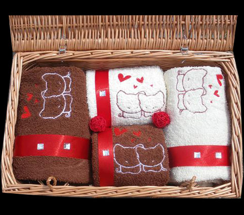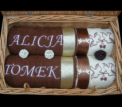 Taki komplet czterech ręczników z haftami układamy w wiklinowym kuferku / walizce oraz ozdabiamy wysokiej jakości dodatkami florystycznymi najlepiej pasującymi do kolorów ręczników oraz haftów.