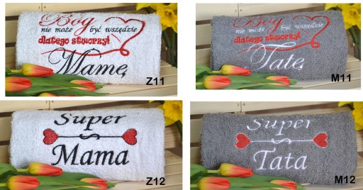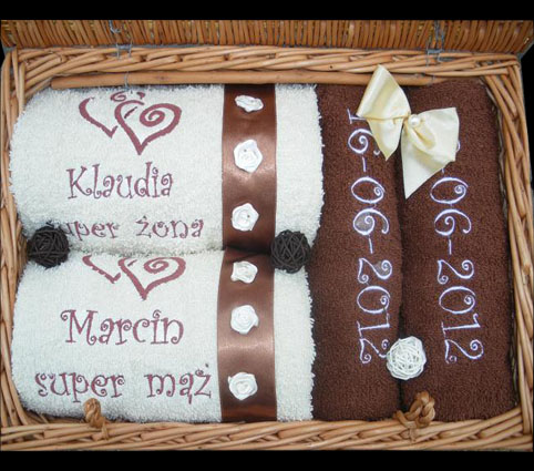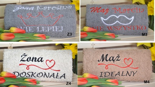 Przedmiotem aukcji jest zestaw 4 ręczników o wymiarach: 2x 70x140cm oraz 2x 50 x 100 cm z indywidualnym haftem. Komplet taki może być idealnym prezentem z okazji ślubu, rocznicy, imienin, urodzin, Dnia Matki, Dnia Ojca, Dnia Babci, Dnia Dziadka, Walentynek oraz wielu innych okazji, gdyż jest to upominek zarazem trwały jak i atrakcyjny poprzez swoją indywidualność. Ręczniki są dość grube, mięciutkie, bardzo dobrze wchłaniają wodę. Gramatura to 400g/m2.