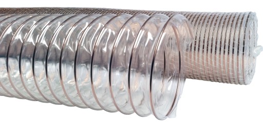 Lekki wąż z poliuretanu o140mm przeznaczony do odpylania o dużej odporności na ścieranie, stosowany przede wszystkim w zakładach przemysłu drzewnego, jak również w wentylacji i wszelkiego rodzaju urządzeniach odciągowych. Przejrzysty poliuretan wewnątrz gładki, na zewnątrz karbowany. Wzmocnienie spirala z drutu stalowego pokrytego miedzią, antystatyczny przez uziemienie spirali. Zakres temp. od -40oC do +90oC. Wąż bardzo lekki i bardzo elastyczny, wysoka odporność na ścieranie i zginanie, a także na warunki atmosferyczne i ozon, oleje mineralne oraz większość chemikaliów. Przeznaczony również do pracy z maszynami w ruchu. Wąż bezhalogenowy spełnia przepisy RoHS. Wąż ściśliwy 1:5 ( 1mb ściśniętego węża daje 5mb po rozciągnięciu ). Wąż jest mierzony po całkowitym naciągnięciu.