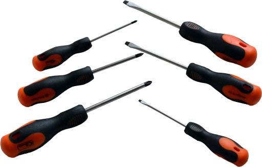 Zestaw zawiera 6 sztuk wkrętaków płaskich oraz krzyżakowych (Phillips).