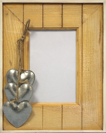 Z boku ramki, na sznurku, umocowane są trzy blaszane, duże, wypukłe serca. Bardzo ciekawy dodatek dekoracyjny.