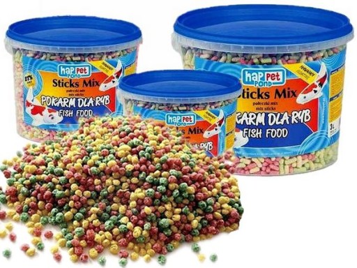 Sticks Mix w postaci 100% pływających GRANULEK firmy HAPPET oryginalnie zapakowane w praktyczne 10 litrowe wiaderko.