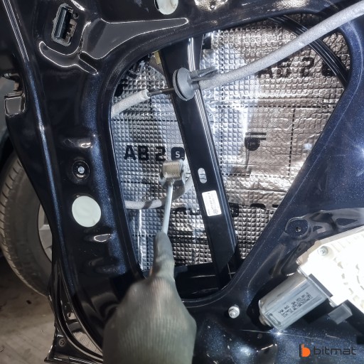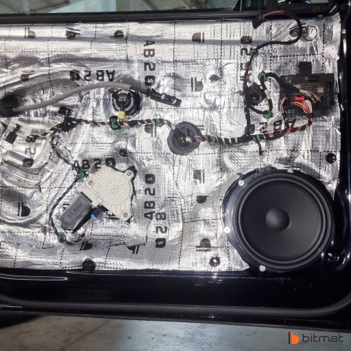 - Maty butylowe naklejamy na niedużą zakładkę — omijamy miejsca montażowe na śruby, a wiązki elektryczne wyciągamy na zewnątrz