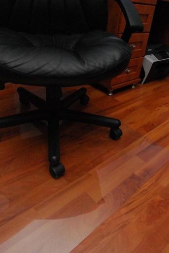 Mata z poliwęglanu idealnie przylega do podłoża, nie faluje i nie ściąga się pod kółkami krzesła tak jak maty PCV.