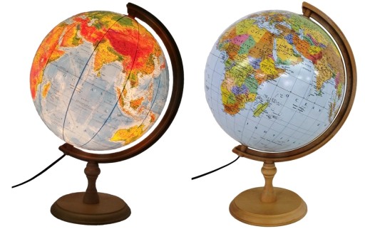 Innowacyjne rozwiązanie podwójnej mapy 2w1. Globus podświetlony to mapa fizyczna. Po zgaszeniu mapa zmienia się na polityczną. Zatem na jednym globusie mamy dwa rodzaje map!