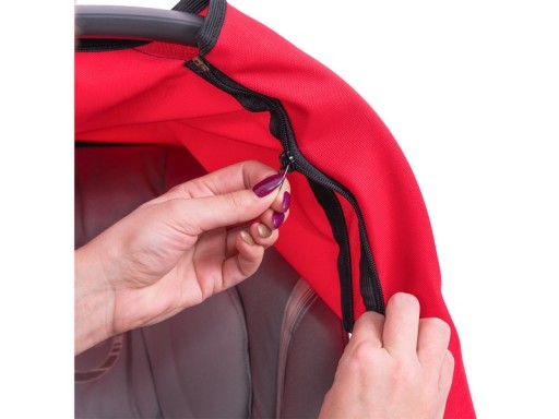 Dzięki wszytym gumką daszek dobrze przylega do brzegów fotelika, posiada usztywnienie aby budka nie opadała na dziecko. Zapinana na zamki błyskawiczne na uchwycie do noszenia fotelika. Posiada również specjalne wycięcia na rączkę (patrz zdjęcie)