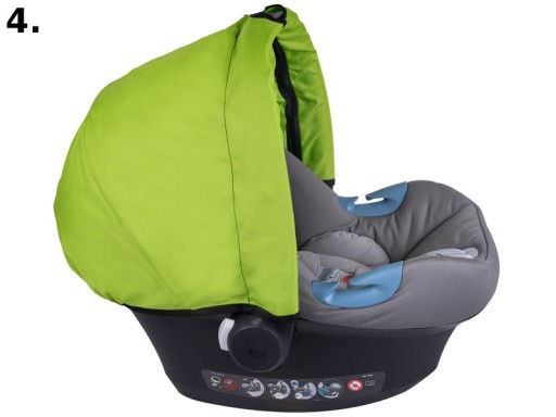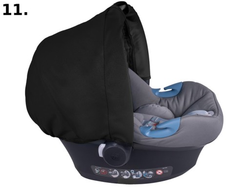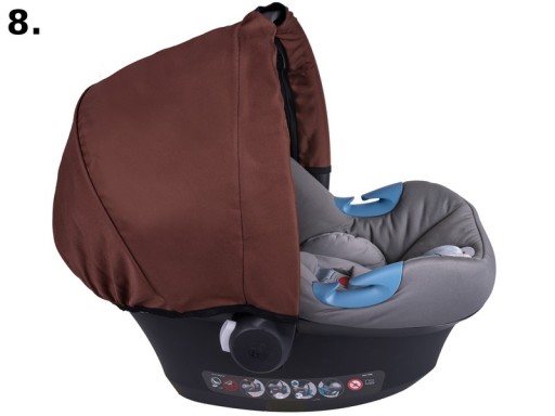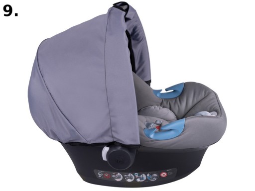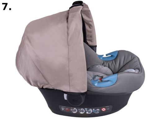 Dzięki wszytym gumką daszek dobrze przylega do brzegów fotelika, posiada usztywnienie aby budka nie opadała na dziecko. Zapinana na zamki błyskawiczne na uchwycie do noszenia fotelika. Posiada również specjalne wycięcia na rączkę (patrz zdjęcie)