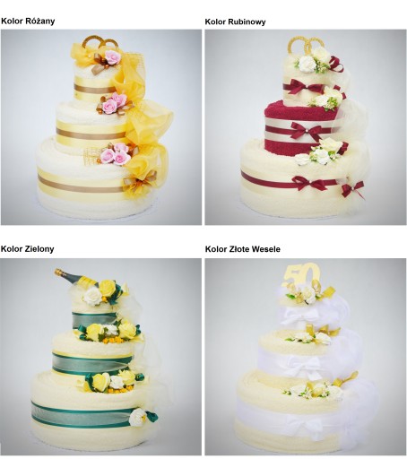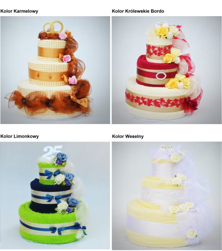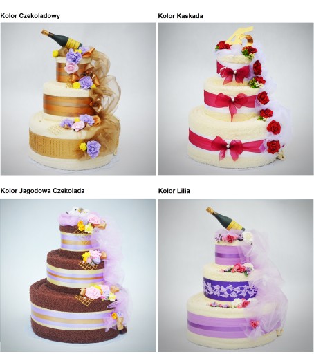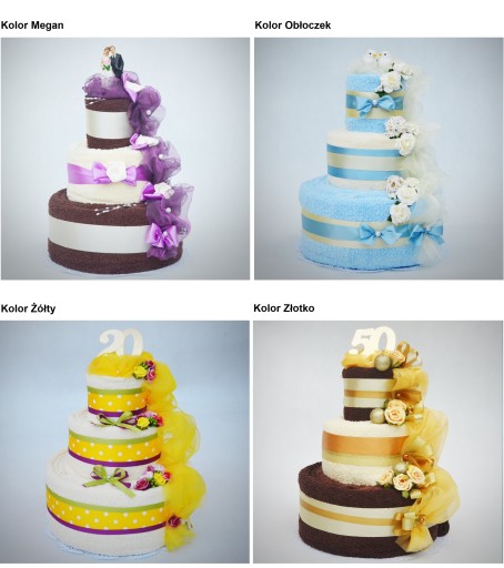 Każdy tort możemy wykonać w dowolnej kolorystyce ręczników - paleta kolorów dostępna poniżej oraz dodać dowolny dodatek na górę tortu.