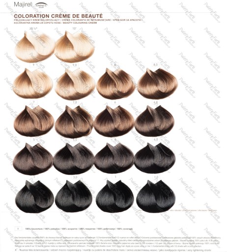 Farba Majirel idealnie pokrywa siwe włosy. W przypadku nie przeważającej ilości siwych włosów (0-50% siwizny) każdy wybrany kolor bardzo równomiernie pokrywa siwiznę.