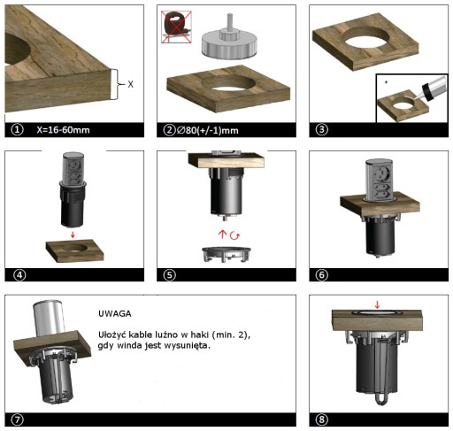 Instalacja jest niezwykle prosta. Winda jest umieszczona w wycięciu o średnicy 79 mm i przymocowana do biurka lub stołu od dołu za pomocą pierścienia blokującego.