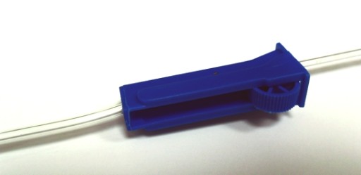 Wąż do soli fizjologicznej jest zakończony plastikową "igłą" do wkłucia w pojemnik z solą.