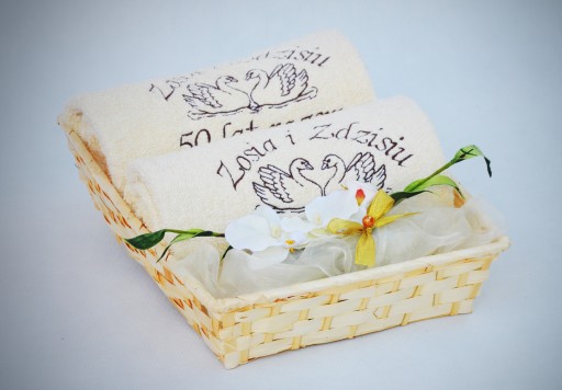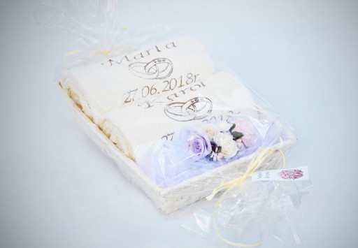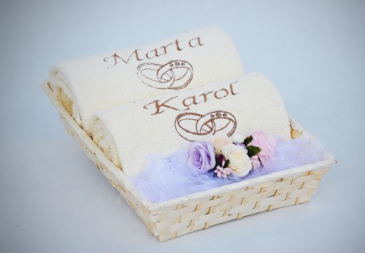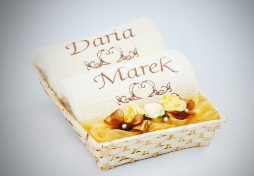Zapraszamy do zakupu pięknie dekorowanego kosza, w skład którego wchodzi komplet 2 grubych, kąpielowych ręczników z Twoimi indywidualnymi haftami.