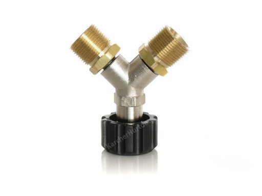 Trójnik jest kompatybilny z myjkami wysokociśnieniowymi KARCHER HD i HDS oraz myjkami innych znanych firm posiadających złącze M22 x 1,5mm.