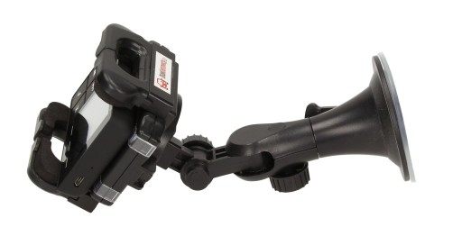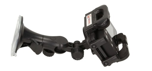 Uchwyt regulowany jest w trzech płaszczyznach: góra-dół , lewo-prawo oraz swobodny obrót 360 stopni plecków mocujących. Solidnie wykonane elementy regulacyjne zapewniają pełną sztywność uchwytu, dzięki czemu niweluje on wszelkie drgania pochodzące z pojazdu. Dodatkowo duża przyssawka o średnicy 8 cm zapewnia bezpieczny montaż do szyby. Ramiona uchwytu są regulowane w zakresie od 4 do 12 cm. Wygodny i sprawnie działający mechanizm blokady i zwolnienia ramion pozwala na komfortowy montaż i szybki demontaż urządzenia z uchwytu. Ramiona mocujące są wykończone miękką pianką, która dodatkowo niweluje drgania i eliminuje możliwość wypadnięcia urządzenia z uchwytu. Uchwyt posiada także długie ramię mocujące, dzięki któremu łatwiej obsłużysz nawigację podczas jazdy.