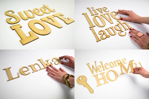 Litery precyzyjnie wycinamy laserem z płyty laminowanej HDF 3mm lub sklejki brzozowej 3mm. Montaż liter - we własnym zakresie (na dwustronną taśmę piankową lub na klej). Literki nadają się jedynie do wnętrz. Literki ze sklejki można użyć na zewnątrz, ale należy je zaimpregnować (jak drewno). Na tej aukcji sprzedajemy literki pojedyncze - każda litera wycięta jest jako osobny element.
