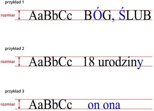 Może zdarzyć się tak, że wymiary litery będą odbiegały od wymiaru bazowego – sytuacje takie oznaczono na rysunku kolorem niebieskim. Przykładowo – kupując litery w rozmiarze 14cm i zamawiając same litery małe „on ona” (zamiast "On Ona") – żadna z liter nie będzie miała 14cm, a proporcjonalnie mniej. Natomiast kupując litery "BÓG" w rozmiarze 14cm, kreseczka z "ó" może wystawać na dużo więcej niż 14cm.