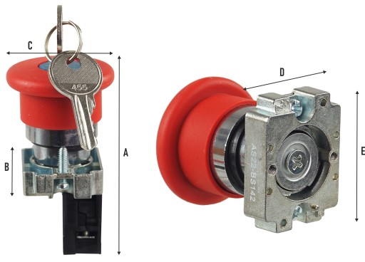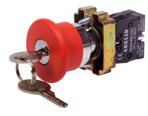 Sposób działania: załączanie poprzez bezpośrednie wciśnięcie grzybka, odryglowywany przez obrót klucza.