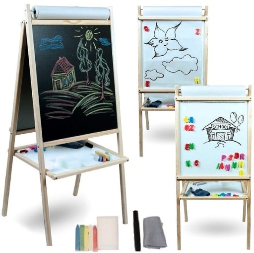 Średnia drewniana, dwustronna i rozkładana tablica magnetyczna to świetny pomysł na kreatywną zabawę Twoich Pociech. Nauka przez zabawę to najlepszy sposób na prawidłowy rozwój dzieci. Tablica jest idealnym miejscem na ćwiczenie pierwszych literek oraz cyferek.To także świetne miejsce do rozwijania zmysłu artystycznego przez wykonywanie wspaniałych rysunków. Z jednej strony jest to tablica magnetyczna do pisania markerami, z drugiej - tradycyjna tablica kredowa. Zamontowaną na szczycie tablicy rolkę papieru - po jej zużyciu można wymienić. Wymienne rolki są dostępne w naszym sklepie.