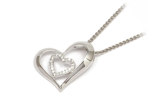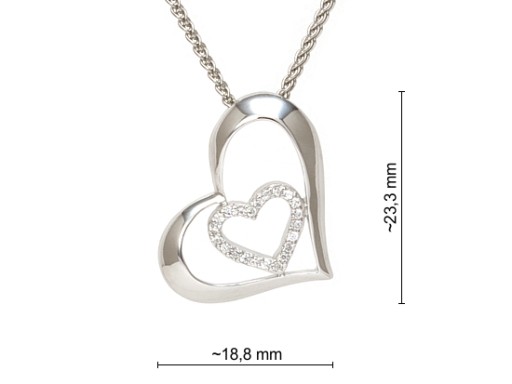 Przedmiotem aukcji jest uroczy srebrny komplet: fantazyjny wisiorek w kształcie stylizowanego serduszka z cyrkoniami oraz łańcuszek. Naszyjnik - zawieszka i łańcuszek - w całości wykonany jest z rodowanego srebra. Warstwa twardego, szlachetnego rodu zabezpiecza srebro przed oksydowaniem (ciemnieniem) i rysowaniem się powierzchni.