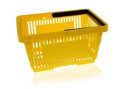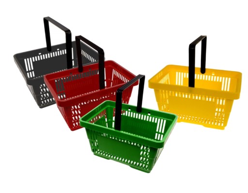 Kosz sklepowy z jedną rączką dostępny w kolorach żółtym, czerwonym, niebieskim, zielonym, pomarańczowym do wyboru.