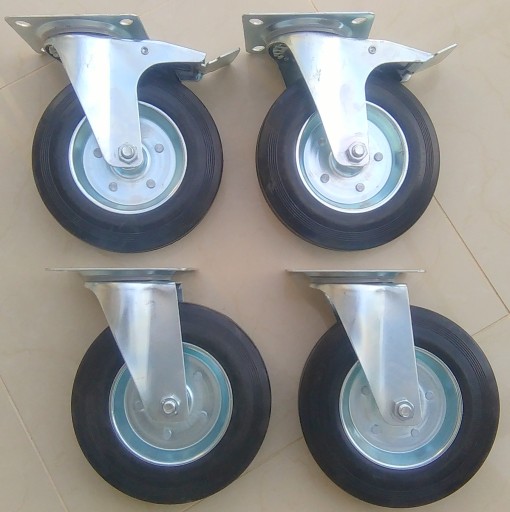 Koła mocowane na tzw. płytkę są połączeniem widelca wykonanego z tłoczonej blachy stalowej oraz koła z piastą stalową i oponką z pełnej, czarnej gumy. Głowica skrętna widelca jest podwójnie ułożyskowana oraz jest zabezpieczona przed zabrudzeniem specjalnym uszczelnieniem przeciwpyłowym. Wszystkie elementy metalowe zestawu pokryte są antykorozyjną powłoką chromowo-cynkową. Hamulec blokuje koło i głowicę.