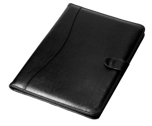 Wykonana z ekoskóry atrakcyjna cenowo czarna teczka wyposażona w kieszonkę na wizytówki, przegródkę na dokumenty oraz wkład papierowy A4. Długopis nie jest dołączony.