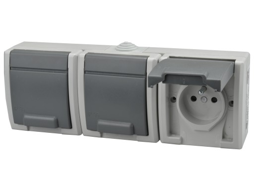 Gniazdo potrójne, natynkowe, hermetyczne, o ochronie IP55, z uziemieniem 2P+PE