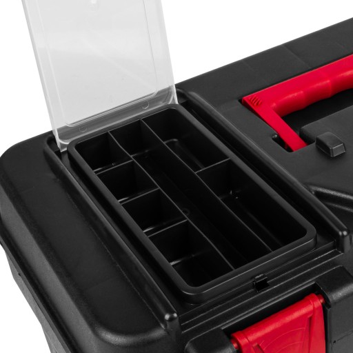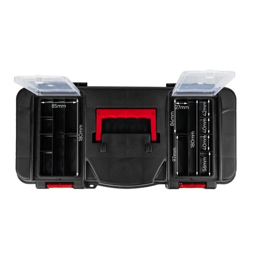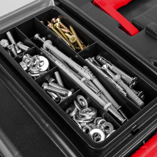 Organizer na narzędzia o wymiarach 59 x 29 x 32 cm serii Caliber, idealnie nadaje się na różnego rodzaju naprawy czy prace, gdzie posiadanie narzędzi na wyciągnięcie ręki jest niezbędne. Dodatkowo skrzynka wyposażona jest w wyciągane wewnętrzne nosidło oraz dwa wbudowane organizery, które jeszcze bardziej dopracują naszą organizację pracy do perfekcji.