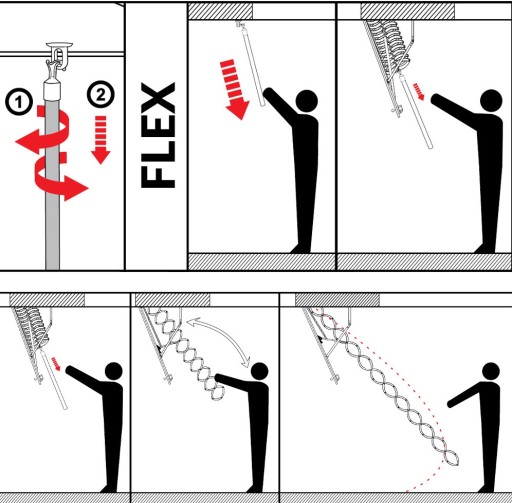 Model FLEX dzięki zastosowaniu solidnej metalowej rozciąganej drabinki "nożycowej" doskonale nadaje się do montażu w pomieszczeniach do 290 cm wysokości, gdzie nie jest możliwe zastosowanie drabin segmentowych z powodu ograniczonej przestrzeni.